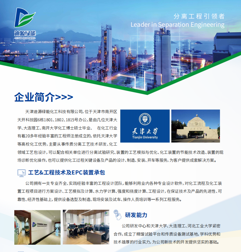 公司成立于2023年,注册资本1000万,由江西省迪尔化工填料有限公司控股,由多位天津大学、大连理 工大学的硕士组成的技术人员,其中中高级技术专业人员35人,拥有一支专业齐全、实践经验丰富的工程设计团队,,公司坐落于天 津市南开区科研西路天津科技广场,环境优美、管理规范。 公司主营业务主要包括工艺技术和设备加工两方面,可为用户提供分离试验研究、工艺技术研发、装置的 工艺模拟与优化、装罟的节能技术改造、装置的现场诊断优化操作、传质分离工艺包设计,可以配合相关单 位进行工艺设计和关键设备及产品的制造、安装、开车等服务,已取得专业生产资质 ,可以承接EPC装置。