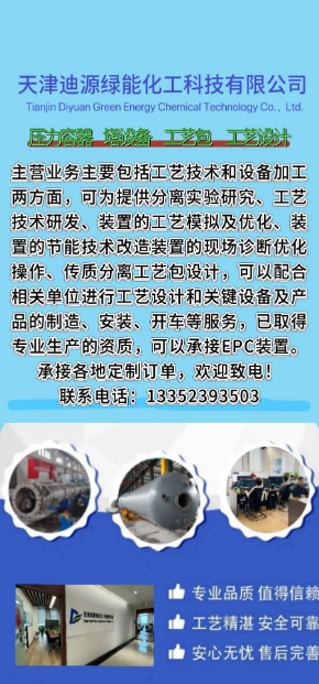 公司成立于2023年,注册资本1000万,由江西省迪尔化工填料有限公司控股,由多位天津大学、大连理 工大学的硕士组成的技术人员,其中中高级技术专业人员35人,拥有一支专业齐全、实践经验丰富的工程设计团队,,公司坐落于天 津市南开区科研西路天津科技广场,环境优美、管理规范。 公司主营业务主要包括工艺技术和设备加工两方面,可为用户提供分离试验研究、工艺技术研发、装置的 工艺模拟与优化、装罟的节能技术改造、装置的现场诊断优化操作、传质分离工艺包设计,可以配合相关单 位进行工艺设计和关键设备及产品的制造、安装、开车等服务,已取得专业生产资质 ,可以承接EPC装置。