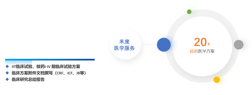米度利用放射性同位素标记 (Radiolabeling)和分子影像(Molecular Imaging)技术,可以为海内外医药企业及科研院所提供药物筛选、生物分布、药代动力学研究、药效学评价等外包技术服务,并针对放射性药物提供包括标记方法开发、药学研究、非临床研究、临床研究、注册申报在内的新药研发一站式整体解决方案。业务重点针对肿瘤、神经系统疾病、自身免疫疾病、心脑血管疾病等研究领域,以及免疫、基因治疗、细胞治疗等创新疗法,探寻疾病机理、开发诊疗药物、评价治疗效果。