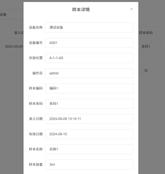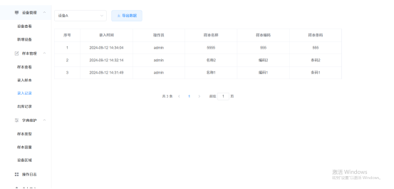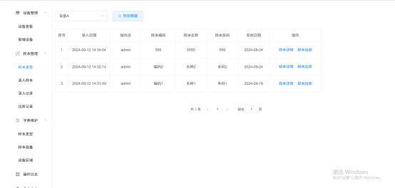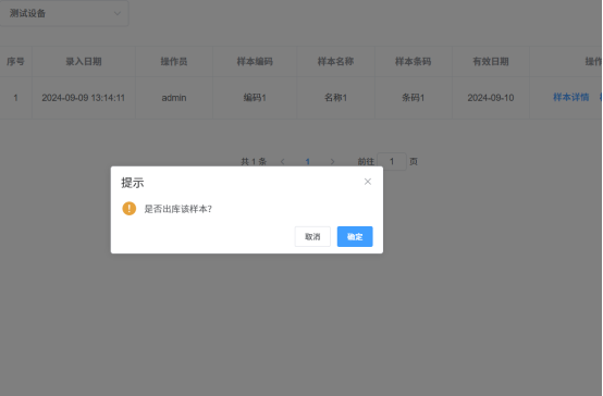 4.样本查看:查看当前设备中已存的样本,可查看样本的详细信息;出库样本操作;提供条件筛选,数据导出功能