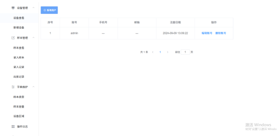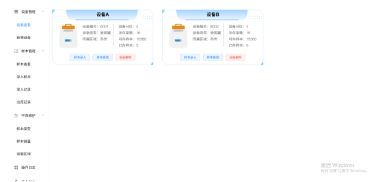 3.设备查看:显示用户添加的设备列表,查看设备信息,设备存储样本状态;样本录入,样本查看,删除设备操作