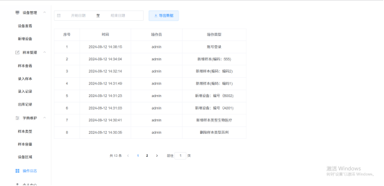 8.操作日志:提供审计功能,追踪平台操作记录,(包括账号登录,样本相关操作,设备相关操作,人员管理相关操作的记录);提供条件筛选,数据导出功能
