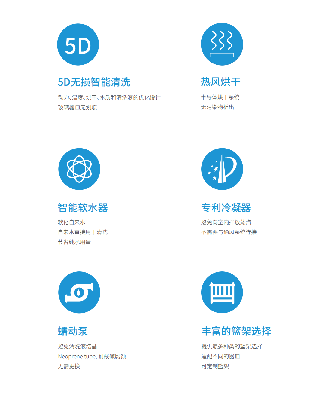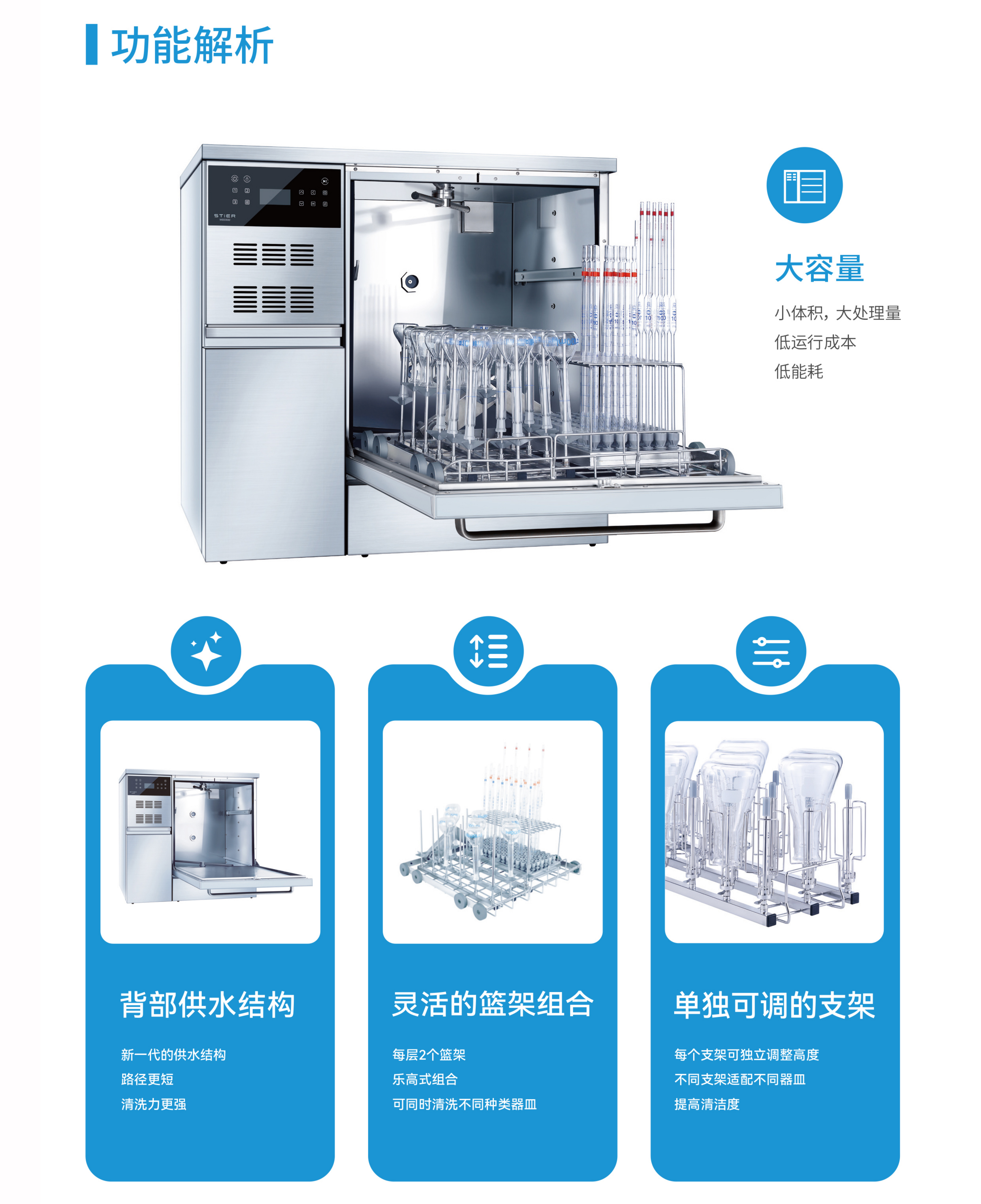 1.小体积,大处理量。自带水软化装置及纯化水自吸泵,无需另行配置。科学合理的设计,使得机器外观更小巧美观,清洗容量及功能更强大,单次可清洗98支移液管,128个容量瓶,444个自动进样瓶……