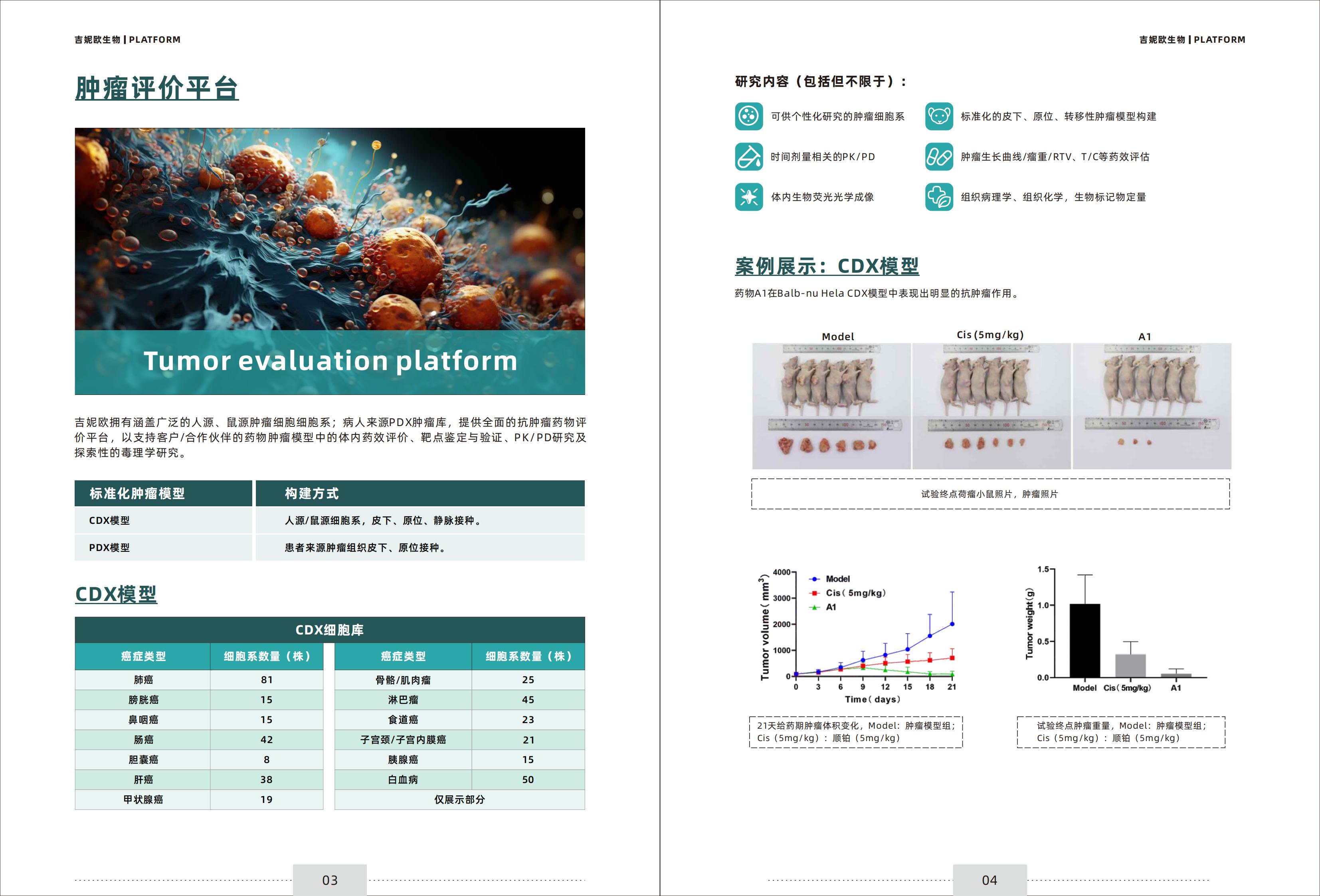 广州吉妮欧生物科技有限公司 吉妮欧生物拥有2000余平的研发服务平台,包含GMP标准的1000+细胞库资源和近万种通路机制的靶点资源,同时具备ABSL-2 、BSL-2备案的生物安全二级实验室(P2), 专业高效的SPF级药效研究平台,可实施大、小动物(鼠、猴等)研究,同时可提供70+不同临床表型和适应症需求的动物疾病模型,以及302+CDX/PDX模型。 围绕着新靶点、新机制的创新药研发需求,吉妮欧始终专注于行业缺乏好用疾病模型的痛点,为用户提供定制化的,符合临床表型和发病机制的疾病模型与药效整体解决方案,助力药企及科研单位提供一站式服务。