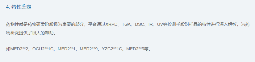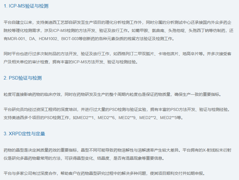 美迪西的理化分析平台先拥有水分仪(KF,容量法和库伦法)、电位滴定仪(PT)、红外光谱仪(IR)、比旋度仪(OR)、自动熔点仪(MP)、X-射线粉末衍射仪(XRPD)、热重分析仪(TGA)、差示扫描量热仪(DSC)、电感耦合等离子体质谱仪(ICP-MS)、激光粒度仪(PSD)、动态水蒸气吸附仪(DVS)、紫外分光光度计(UV-Vis)等仪器,可提供如下理化检测服务: