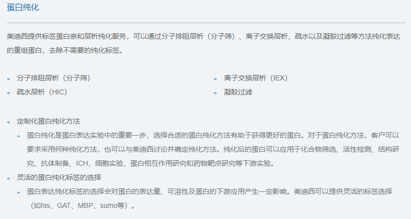 美迪西生物医药在重组蛋白表达与纯化服务方面经验丰富,美迪西生物医药拥有多种蛋白表达系统,包括原核蛋白表达系统、酵母蛋白表达系统、昆虫细胞蛋白表达系统(杆状病毒)、哺乳动物细胞蛋白表达系统,具备多种融合技术,可以为您在蛋白表达与纯化方面提供多种选择。从方案设计、基因优化、表达条件优化到纯化的技术体系,以提高您的目的蛋白表达水平。