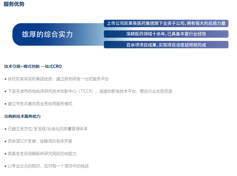 收藏天津凯诺医药科技发展有限公司是凯莱英医药集团旗下全资子公司,服务范围涵盖临床前研究及I-IV期临床研究,致力于为全球合作伙伴提供全流程、高质量的新药研发服务。业务范围涵盖从新药IND到NDA的一站式全流程,形成了包括从临床前项目管理、注册事务、临床监查、临床研究项目管理、SMO服务、数据管理与统计、第三方稽查、药物警戒直至上市后研究的整体闭环解决方案。