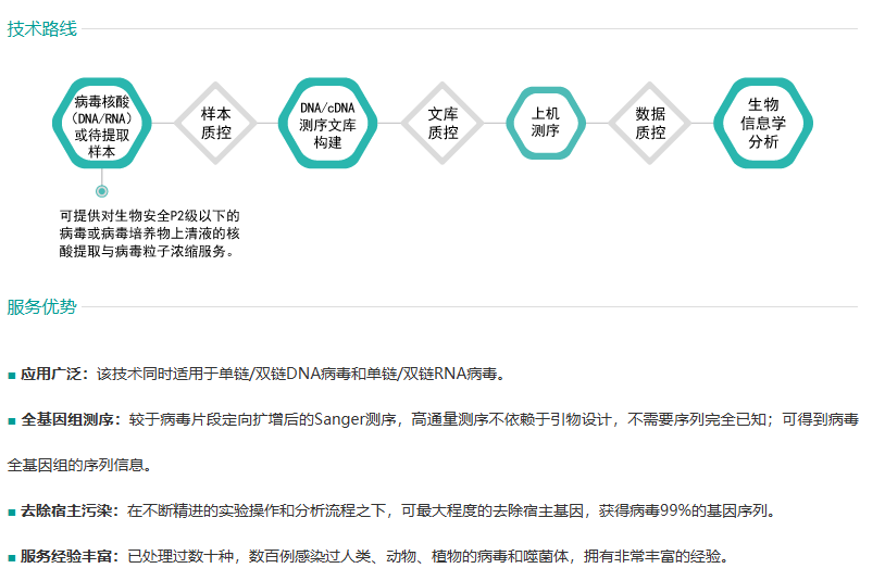 在病毒研究和相关生产当中,传统的Sanger测序方法只能够对已知序列病毒的特定序列进行扩增测序,而病毒基因组测序可基于高通量测序技术平台上对病毒全基因组进行测序,利用生物信息分析手段,得到病毒的全基因组序列,解析编码信息,并获得相应的变异信息。