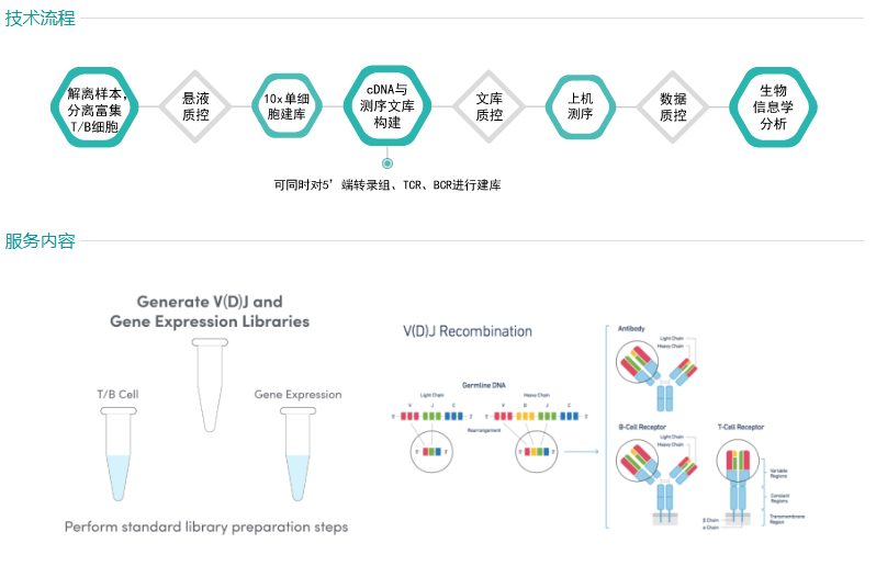 常规免疫组库VDJ测序被广泛的应用于TCR和BCR的多样性研究,但是其无法在单个细胞的水平上完成单细胞α链和β链,或重链/轻链配对信息的精确分析。而10x Genomics Chromium系统利用微流控技术分选单个细胞后将细胞分配到油包水微反应体系中,并通过每个微反应体系中含有的特定DNA标记序列(10x barcode和UMI )来区分不同单细胞和转录本。在对细胞内转录本进行逆转录后,可将cDNA分为3份,其中两份可分别用于构建TCR或BCR免疫组文库,另一份可用于构建5’转录组文库,从而实现在单细胞水平同时对基因转录本和免疫组库进行高通量测序。