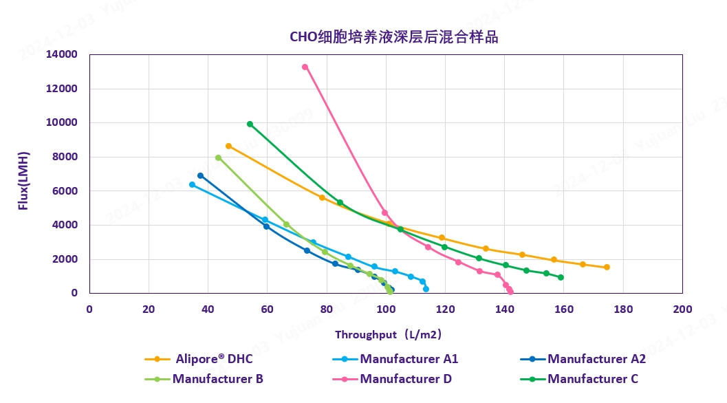该料液测试中,Alipore® DHC系列对比市场上同类产品中表现出相对高流速和高载量优秀能力,可实现工艺效率和经济效益最优化。