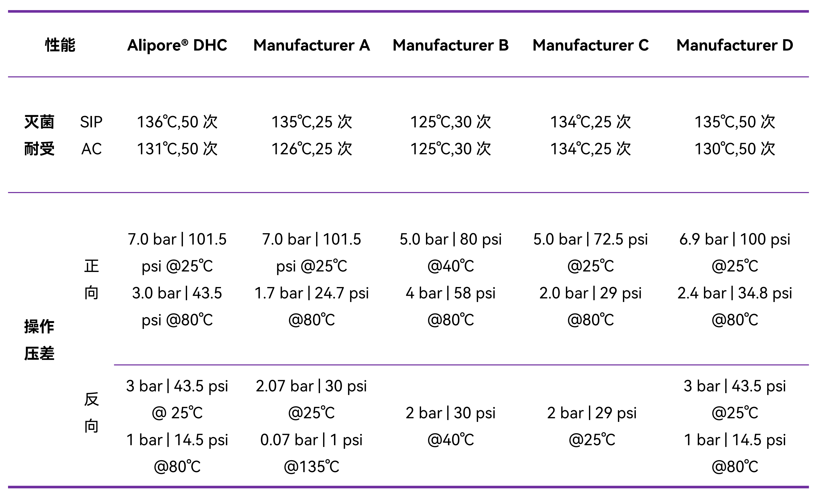 在高温灭菌和工作压力特性方面,Alipore® DHC系列相对市场上主流品牌除菌过滤器,拥有更高的重复灭菌和液体压力耐受水平,且通过了严格的滤器工艺验证。