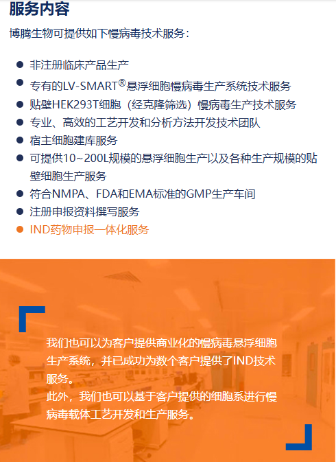 苏州博腾生物制药有限公司成立于2018 年12月,立足于苏州工业园区,以上市公司-重庆博腾制药科技股份有限公司(股票代码:300363)为依托,搭建了质粒、病毒载体、细胞治疗、基因治疗、核酸疗法等CRO和CDMO平台,提供从科研包装,建库,工艺开发,分析方法开发,cGMP生产到制剂灌装的端到端服务,贯穿药物的不同研发阶段,帮助客户加快药物研发与上市进程。