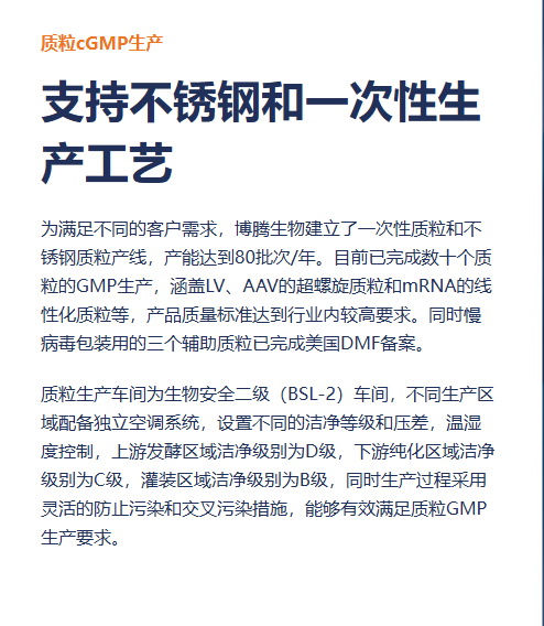苏州博腾生物制药有限公司成立于2018 年12月,立足于苏州工业园区,以上市公司-重庆博腾制药科技股份有限公司(股票代码:300363)为依托,搭建了质粒、病毒载体、细胞治疗、基因治疗、核酸疗法等CRO和CDMO平台,提供从科研包装,建库,工艺开发,分析方法开发,cGMP生产到制剂灌装的端到端服务,贯穿药物的不同研发阶段,帮助客户加快药物研发与上市进程。