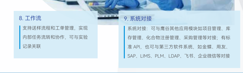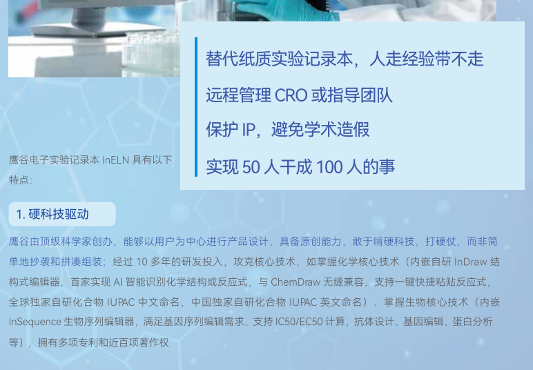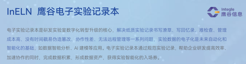 鹰谷明星产品——电子实验记录本InELN,支持云端部署或本地私有部署,节省实验记录时间,确保记录完整准确,积累数据,提升管理效率。通过全文搜索、结构式搜索、基因序列比对、数据结构化等,便于合作者间实现网络协同、促进合作,大大提高团队工作效率,避免“一半人重复另一半人的失败”,成就“一半人复制另一半人的成功”,帮助企业50人做出100人的业绩,帮助企业采用新一代的数字化生产力工具和管理工具,在生物药物、小分子药物、医疗器械、新材料、化工、农业、食品等研发上抢占先机。
