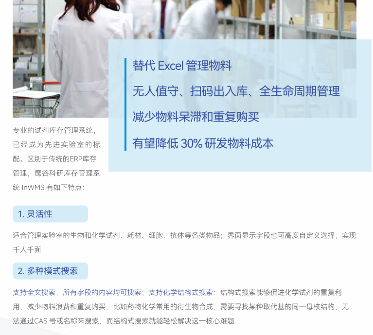 上海鹰谷信息科技有限公司(Integle)成立于2013年,致力于为企业建立自己的研发数据库。以电子实验记录本为中心,提供电子实验记录本InELN、试剂与生物样本库存管理InWMS、科研采购管理InPMS、化合物与生物分子注册管理InCMS等数字化实验室软件,由科学家打造,拥有生物序列编辑器InSequence、结构式编辑器InDraw等工具类软件