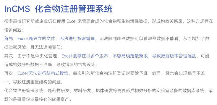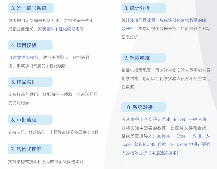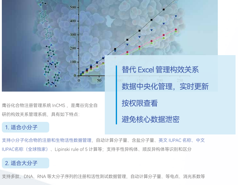 上海鹰谷信息科技有限公司(Integle)成立于2013年,致力于为企业建立自己的研发数据库。以电子实验记录本为中心,提供电子实验记录本InELN、试剂与生物样本库存管理InWMS、科研采购管理InPMS、化合物与生物分子注册管理InCMS等数字化实验室软件,由科学家打造,拥有生物序列编辑器InSequence、结构式编辑器InDraw等工具类软件,经过10多年的迭代开发,掌握IUPAC中英文命名、化学结构高精度AI图像识别、质粒设计、引物设计等专业技术,实现国产替代,解决很多行业“卡脖子”问题。服务团队大多数为来自世界五百强、北京大学、复旦大学、上海交通大学、浙江大学等化学、生物领域的科学家和工程师,做到真正理解客户需求,为客户的业务场景提供更专业的解决方案,具备30分钟快速反馈的响应机制,让客户更安心。