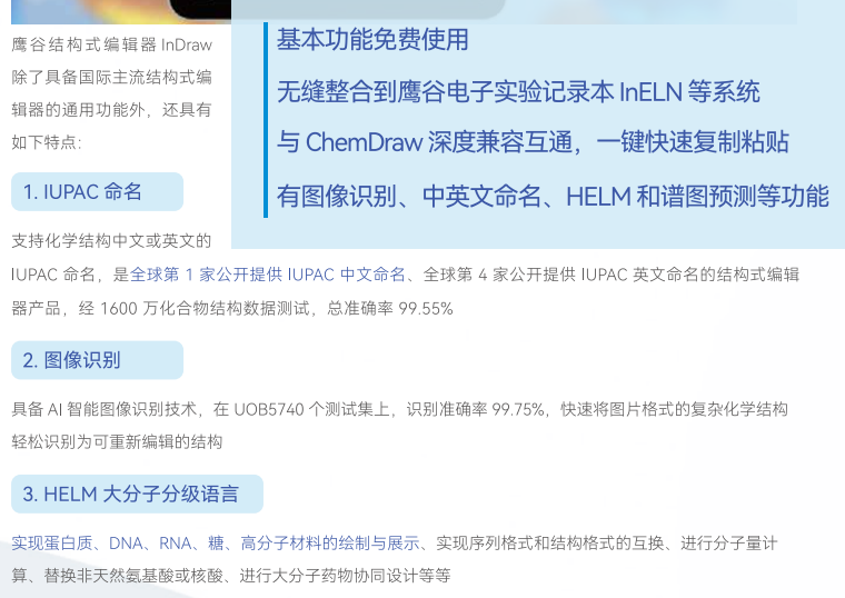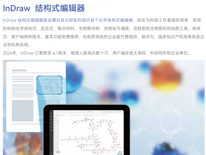 鹰谷核心工具软件——InDraw结构式编辑器,是国内首个自主研发的全功能化学结构式编辑器,旨在为化学和生物科研人员提供简单、易用的绘制化学结构式、反应式、高分子材料、生物聚合物、生物信号通路、科研素材的绘图工具,支持化学结构中文(全球首家)或英文的IUPAC命名,高精度AI化学结构式图像识别,HELM大分子分级编辑语言(用于绘制多肽、核酸、多糖、高分子材料等),兼容ChemDraw,有网页端、客户端两种版本,已被大量用于发表专利和论文,生成高质量的矢量图。