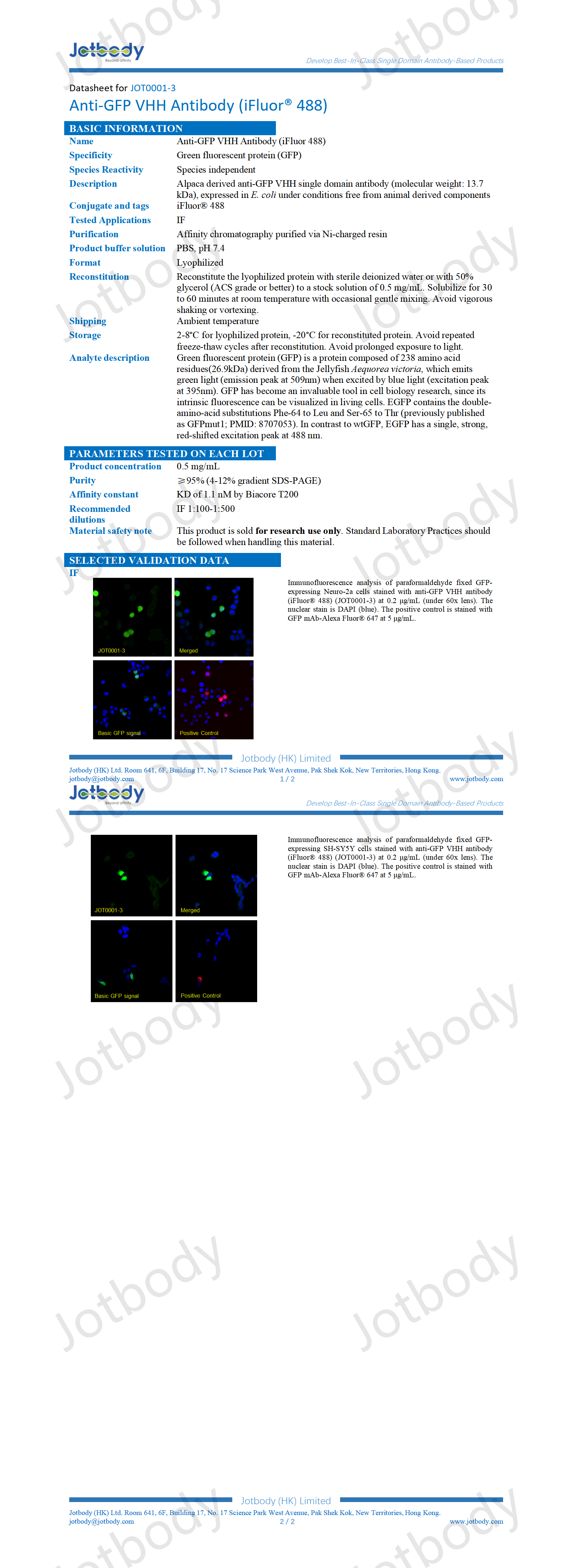 Alpaca anti-GFP VHH, purified recombinant binding protein, conjugated to iFluor® 488.