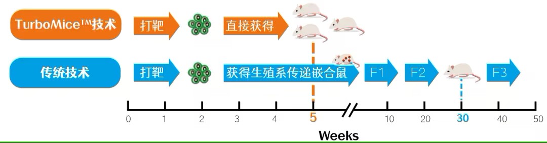 明迅生物结合四倍体补偿技术,基因编辑技术及小鼠胚胎干细胞技术,开发的新一代模式小鼠技术(TurboMice™技术)可实现几乎任何目标基因位点的编辑,可由小鼠胚胎干细胞直接制备完整纯合基因编辑小鼠个体,绕开了常规技术耗时的繁育步骤,周期从1年以上缩短到2个月,达到理论上的极限速度,并使小鼠的生产效率由1-5%提高到了30-60%的水平,可一次性批量生产完全来自于基因编辑干细胞的小鼠。