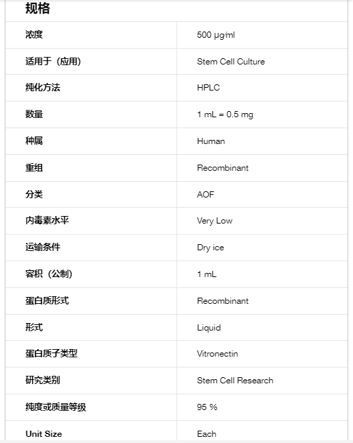 Unlike standard basement membrane extracts (BMEs), vitronectin (VTN-N) was designed in the laboratory of James Thomson for use with Essential 8™ Medium and has been shown to support human pluripotent stem cell attachment and survival better than wild type vitronectin. Vitronectin (VTN-N) provides an optimal environment for feeder-free pluripotent stem cell culture.