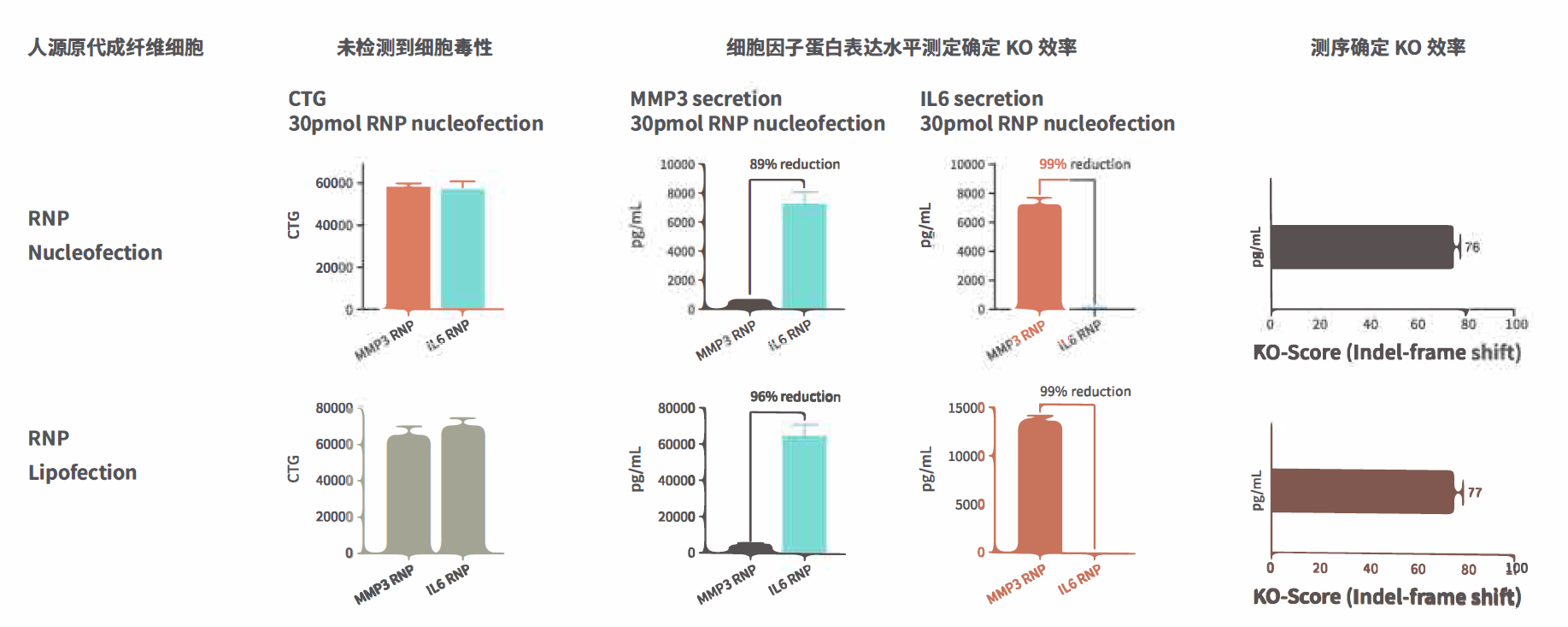 - 更低的毒性:RNP法避免了病毒及质粒的使用,避免激活细胞内的DNA/RNA sensing通路,降低了细胞毒性;