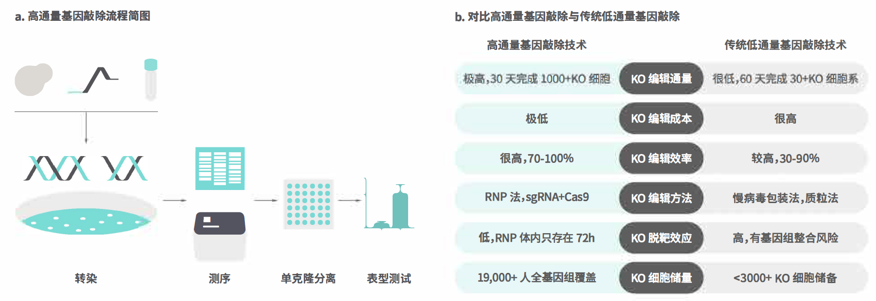 - 高通量基因敲除是通过采用RNP法(Cas9与sgRNA形成复合物)替代传统的慢病毒和质粒法,结合自动化移液工作站和高效电转化平台,实现从低通量到高通量的基因敲除技术与产能的发展。同时,运用生物信息学方法优化gRNA设计,提高编辑效率并降低脱靶风险。