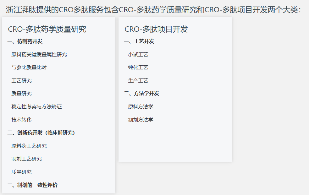 经过多年的技术积累和工艺探索,公司已拥有业内领先的多肽药物合成与生产技术平台,掌握了一系列多肽原料药规模化生产的核心技术,包括功能树脂修饰技术、特殊氨基酸片段合成技术、长肽分段合成技术、多环肽定向合成技术、长肽聚集物控制技术、多肽特定基团修饰技术等多肽合成和修饰类自主核心技术。多肽原料药的工艺研发和生产能力是公司主要竞争优势和业务发展的基础,公司挑选在国内外具有较大市场容量及较强市场竞争力的多肽原料药品种进行研发,已搭建了丰富的产品管线,完成了多种多肽原料药的研发布局,产品管线涵盖亮丙瑞林、司美格鲁肽、利拉鲁肽、利那洛肽等知名品种。
