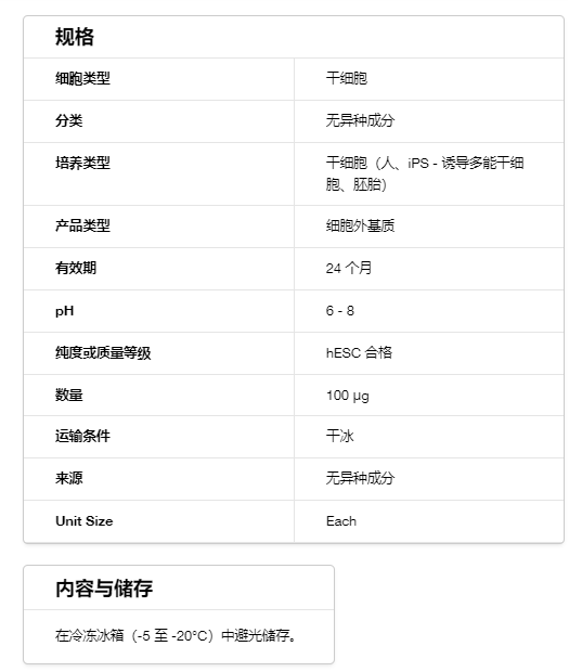 重组人层黏连蛋白 521 (rhLaminin-521) 是一种重组人蛋白,用于为人多能干细胞 (PSC) 的无饲养层培养提供一层成分明确的表面。业已证实,配合 Essential 8™ 培养基一起使用时,即使没有小分子抑制剂,rhLaminin-521 也可促进应激条件下的细胞生存。研究表明,rhLaminin-521 能够支持 PSC 生长达 >20 代而没有任何核型异常迹象,并保持 PSC 分化为所有三种生殖细胞系的能力。与 Essential 8 培养基联合使用时,rhLaminin-521 还可在饲养层依赖性培养到无饲养层培养过渡期间为人体细胞提供理想的重编程效率以及为人多能干细胞提供理想的存活率。有关结合培养基和底物的试剂盒,请参阅 Essential 8™ 适应试剂盒。