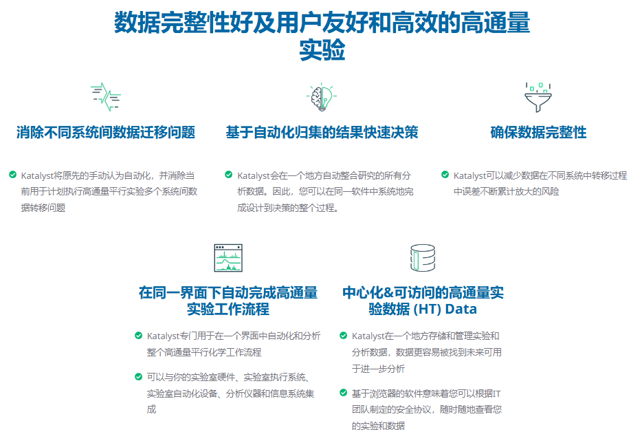 Katalyst可应用场景为研发阶段的高通量实验(HTE)。自动连接每个实验和实时分析数据意味着果断而高效的决策.