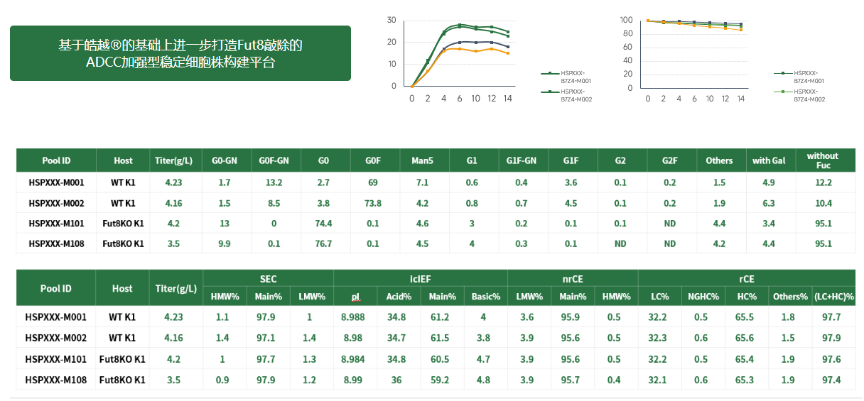 基于可商业化授权的CHOK1宿主细胞,开发了HaoYue®皓越岩藻糖敲除细胞株平台,可通过转染、筛选获得均一、稳定的低岩藻糖修饰细胞株,具有ADCC增强效应。