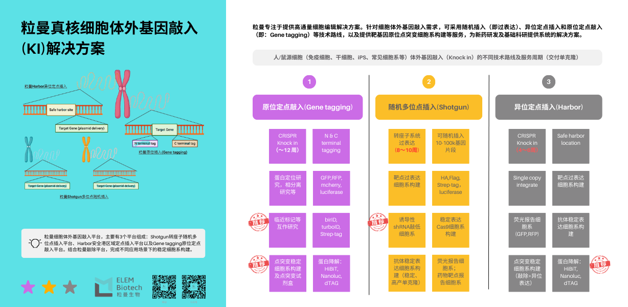 粒曼采用自主开发的定点基因敲入(gene knock in) pCargo-Harbor平台将目的基因插入到HEK293细胞的AAVS1安全港位点。该方法优于基于慢病毒和转座子系统的基因敲入,实现在细胞安全港AAVS1位点定点单拷贝插入目的基因,该插入位点为转录活性位点且不影响其他基因的功能,而且产生的细胞基因型一致,表达均一,遗传稳定。