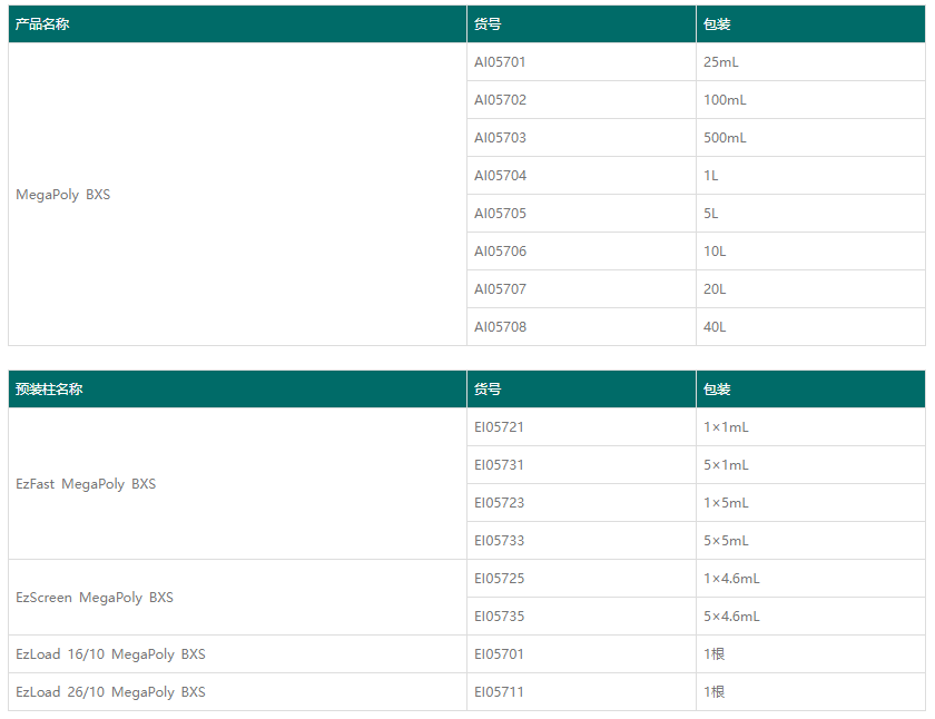MegaPoly BXS是一种强阳离子交换介质,是交联聚苯乙烯-二乙烯基苯基架,表面键合磺丙基功能基团,通过化学偶联方式制备,平均颗粒大小约50 μm。经过特殊设计的孔径结构,具有较大的贯穿孔和扩散孔,一方面,流速可以大大提高,而不影响生物分子结合载量和分辨率;另一方面,可以保证生物分子和功能基团快速相互作用,赋予了产品高流速、高载量,高分辨率的特点。因此,被广泛应用于重组蛋白、单克隆抗体、DNA、病毒和多肽等大尺寸生物分子的快速、高效分离纯化,在生物医药领域应用前景广阔。