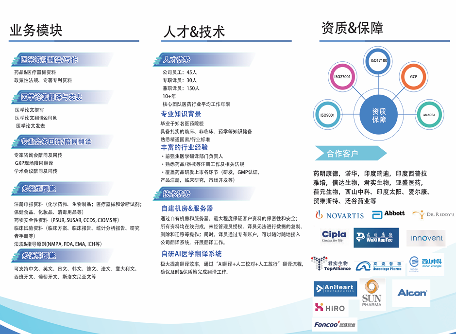 博才众译高端医学翻译服务,翻译资料类型包括:药品进出口注册申报(Pre-IND、IND、NDA、ANDA)、GMP、PV、DMF等资料。公司翻译产品类型涵盖小分子、大分子、细胞治疗等药品,以及诊断及外科治疗器械产品。专业领域涉及:药学类(CMC)、临床(Clinical)、非临床(Non-clinical)、医疗器械(MDD)等。