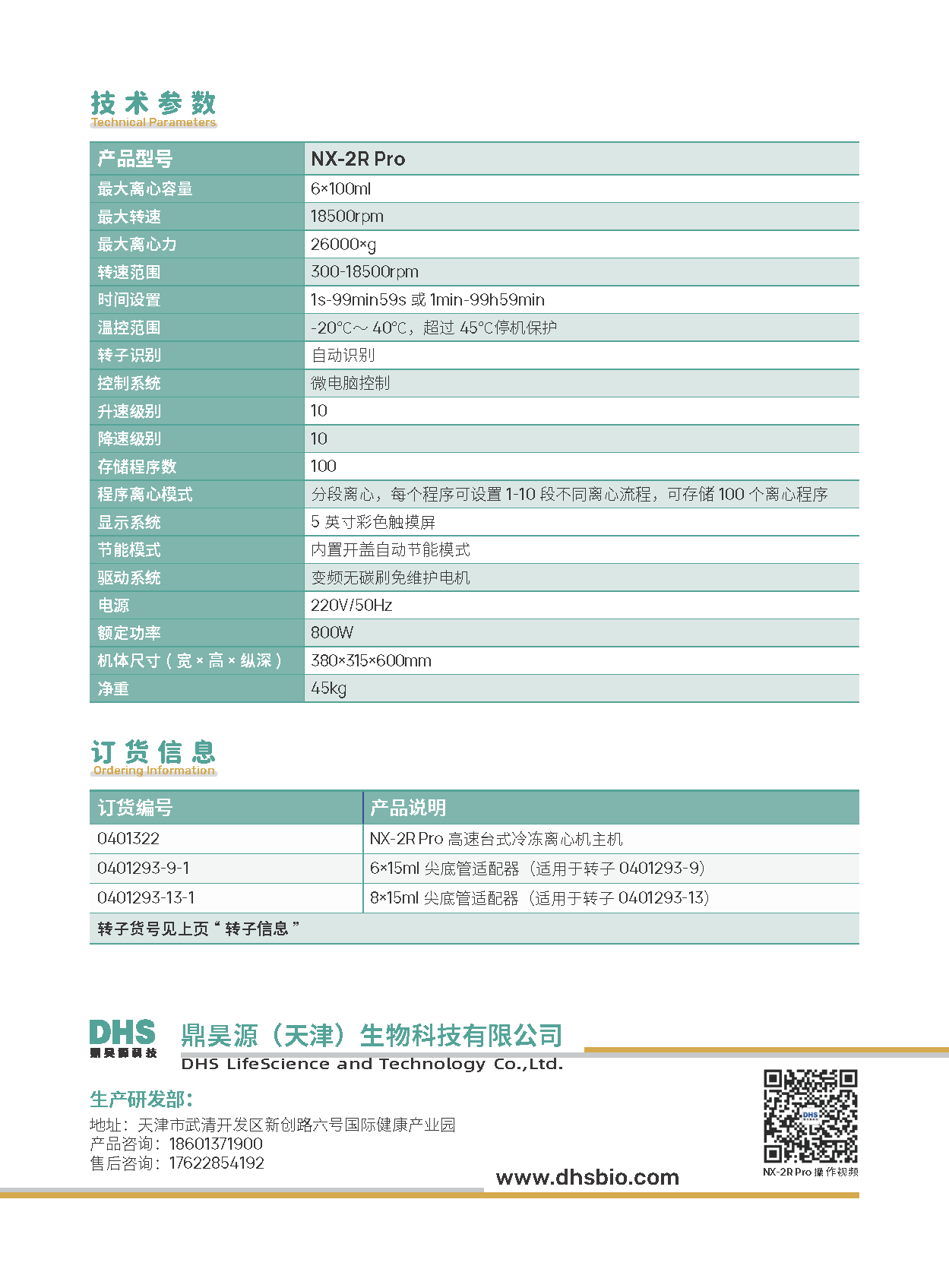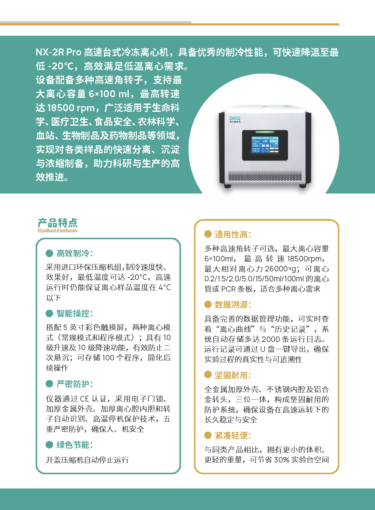 NX-2R Pro 高速台式冷冻离心机,具备优秀的制冷性能,可快速降温至最低 -20℃℃,高效满足低温离心需求。设备配备多种高速角转子,支持最大离心容量 6×100 ml,最高转速达18500rpm,广泛适用于生命科学、医疗卫生、食品安全、农林科学,血站、生物制品及药物制品等领域实现对各类样品的快速分离、沉淀与浓缩制备,助力科研与生产的高效推进。