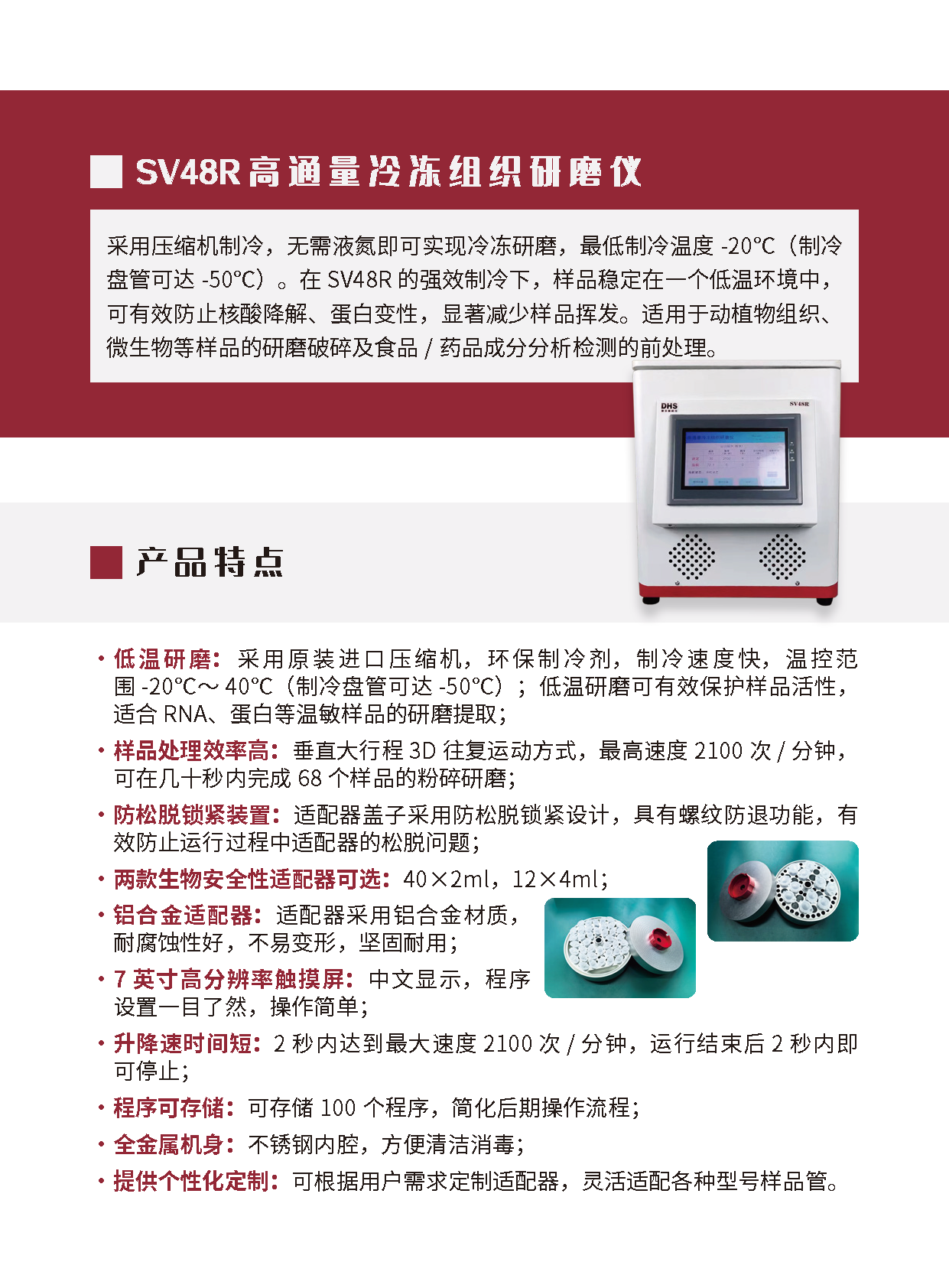 采用压缩机制冷,无需液氮即可实现冷冻研磨,最低制冷温度 -20℃(制冷盘管可达 -50°C)。在 SV48R 的强效制冷下,样品稳定在一个低温环境中,可有效防止核酸降解、蛋白变性,显著减少样品挥发。适用于动植物组织微生物等样品的研磨破碎及食品/药品成分分析检测的前处理。