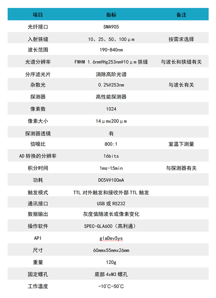 高利通生产的N3SP小M型光纤光谱仪采用M光学结构、光栅分光、高性能光电探测器和SMA905光纤接头。可以选择Micro-USB 接口、RS232或其它通讯接口, 可由电脑或外部供电。N3SP具有宽光谱范围、大动态范围和体积小外形美观等特点。