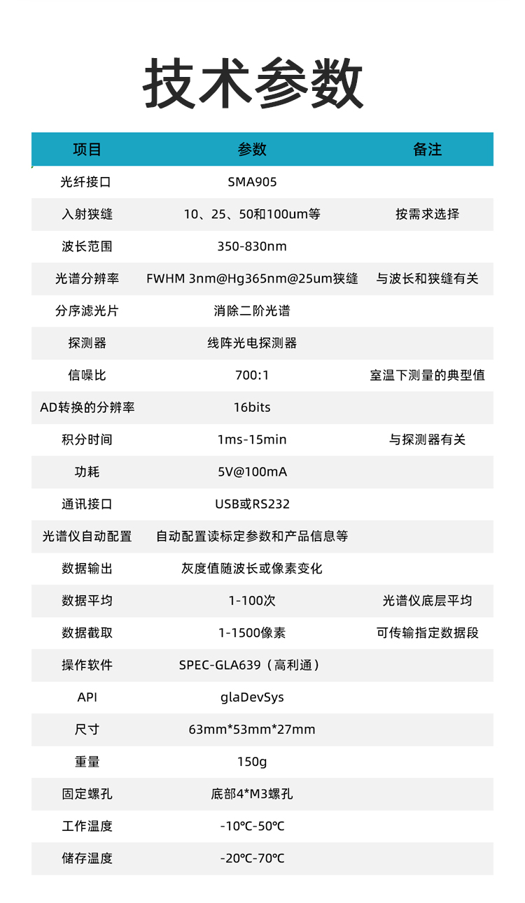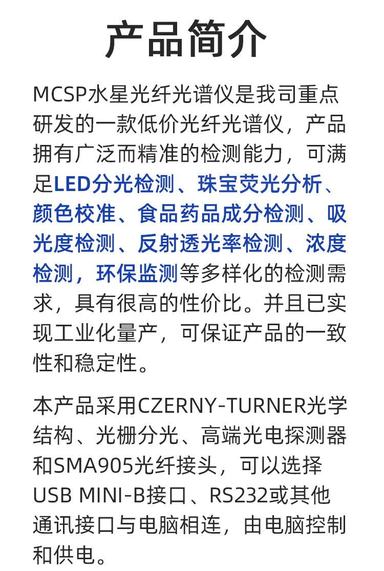 高利通生产的MCSP水星光纤光谱仪采用M光学结构、线阵光电探测器和SMA905光纤接头。可以选择Micro-USB 接口、RS232或其它通讯接口, 可由电脑或外部供电。MCSP具有宽光谱范围、 大动态范围和体积小外形美观等特点。软件操作简易,具有自动配置光谱仪、自动读取光谱仪校准系数、光谱采集与测量等功能。软件界面直观地显示波长与强度的光谱曲线,可以放大观察光谱更细微峰值大小,切换显示强度与波长或像素的光谱曲线。光谱测量功能包括辐射测量、透过率测量、吸收率测量和反射率测量等。