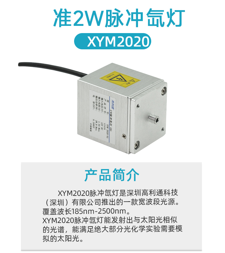 高利通生产的XYM2020脉冲氙灯,是一款宽波段光源。XYM 2020所用的脉冲氙灯最大输入功率是2W,其光强度可以通过内部电位器来控制,脉冲频率由外部脉冲控制。XYM 2020便于安装,配有标准SMA905光纤接头, 既可以用光纤输出光,也可以直接输出光。XYM 2020氙灯具有高稳定性和使用寿命长等特点, 是测气和测水等光谱分析应用的理想光源。