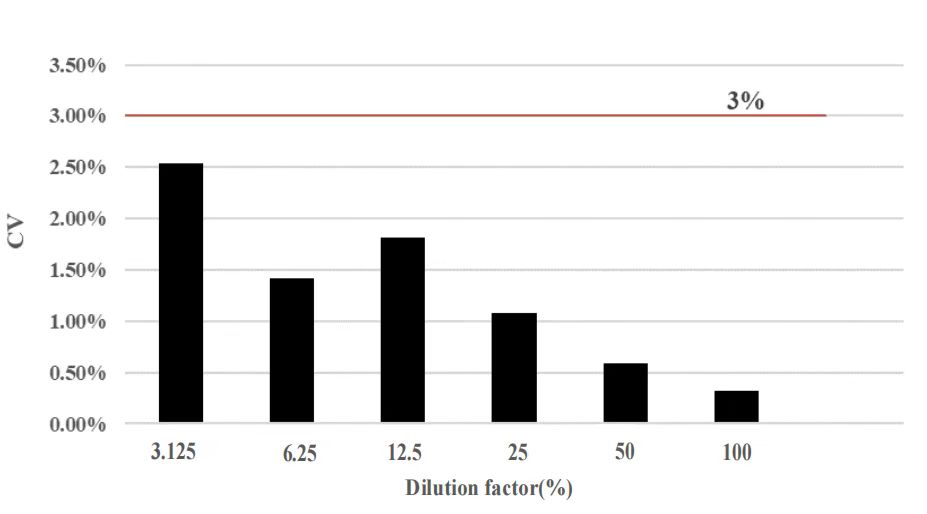 在CytScop®Pro仪器的最佳测试范围内,对梯度稀释CHO细胞样本测试,CV<3%,说明仪器对各稀释浓度均表现出了非常好的稳定性;R²>0.999, 说明仪器表现出良好的线性相关性。