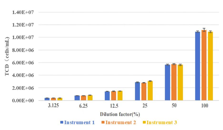 随机3台CytScop®Pro仪器对梯度稀释CHO细胞样本测量,在各稀释浓度下:单因素方差分析显示P>0.05,多台仪器间的测量结果无显著性差异,说明多台仪器间具有较小的台间差。