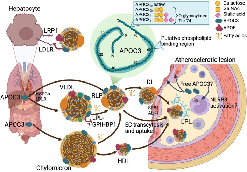 APOC3可通过抑制脂蛋白脂酶(lipoprotein lipase, LPL)活性来增加血浆甘油三酯水平,并通过干扰LDLR和低密度脂蛋白受体相关蛋白1(LDL receptor-related protein1, LRP1)对TRLs及其残余物的清除来增加甘油三酯和胆固醇水平。TRLs清除率的降低与血浆APOC3水平的升高密切相关,APOC3可作为降低血脂异常和CVD风险的新兴治疗靶点。[4]