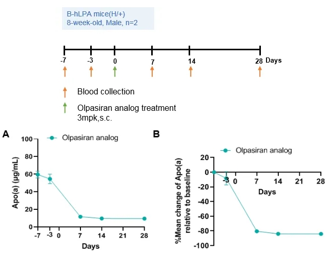 对异质B-hLPA小鼠在响应olpasiran类似物时血浆Apo(a)水平的变化。Olpasiran类似物(由客户提供)是一种针对脂蛋白(a)能有效降低血浆Lp(a)浓度的双链小干扰RNA(siRNA)。如图所示,Olpasiran类似物降低了杂合B-hlpa小鼠(a)的载脂蛋白(a)浓度,单次给药后比基线(B)降低了80%以上。这些小鼠可用于临床前疗效研究。