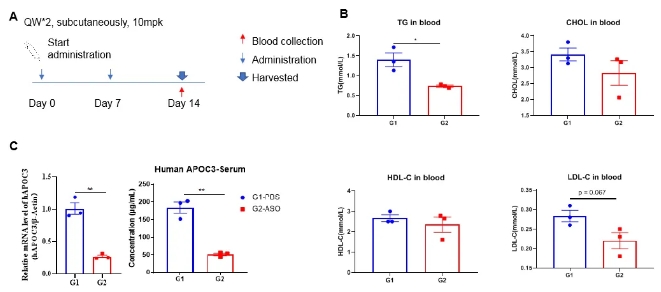 核酸药物对B-hAPOC3小鼠中人APOC3的抑制效率。(A)实验处理示意图。(B)治疗后B-hAPOC3小鼠的血脂水平。与对照组(G1)相比,治疗组(G2)TG明显降低。(C)肝脏中人APOC3 mRNA和血清中人APOC3蛋白表达情况。与对照组(G1)相比,治疗组(G2)中人APOC3 mRNA明显减少,抑制率为73.4%,证明B-hAPOC3小鼠为人APOC3靶向核酸药物的体内评价提供了一个强大的临床前模型。值表示为均值±SEM。