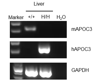 通过RT-PCR对野生型C57BL/6小鼠和B-hAPOC3小鼠中APOC3 mRNA表达进行种属特异性分析。从野生型C57BL/6小鼠和纯合B-hAPOC3小鼠中提取肝RNA,通过反转录合成cDNA文库,使用小鼠或人APOC3引物进行PCR。小鼠Apoc3 mRNA只在野生型C57BL/6小鼠中检测到。人APOC3 mRNA仅在纯合B-hAPOC3小鼠中检测到,而在野生型小鼠中检测不到。