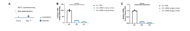核酸药物对B-hCFB小鼠中人CFB的抑制效率。将B-hCFB小鼠随机分为三组(每组3只,8周龄,雄性)。根据专利合成的针对人CFB的siRNA类似物(G2 1mpk, G3 3mpk)和G1 PBS分别给予小鼠。在第7天处死小鼠,收集肝组织和血浆以通过qPCR和ELISA检测人CFB mRNA和蛋白质的表达水平。(A)实验处理的示意图。(B)B-hCFB小鼠剩余%的人类CFB蛋白质。(C)肝脏中人类CFB mRNA的表达。治疗组(G2、G3)中的人CFB明显减少与对照组(G1)相比。值表示为平均值±SEM。通过单因素ANOVA测试确定显着性差异。****p<0.0001。