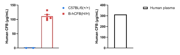 通过ELISA对野生型C57BL/6小鼠和纯合B-hCFB小鼠中的种属特异性CFB表达进行分析。从野生型C57BL/6小鼠和纯合B-hCFB小鼠中分离出血清,并使用种属特异性的CFB ELISA试剂盒(Abcam,ab137973)进行ELISA分析。人的CFB仅在纯合B-hCFB小鼠中可检测到,而在野生型小鼠中则无法检测到。