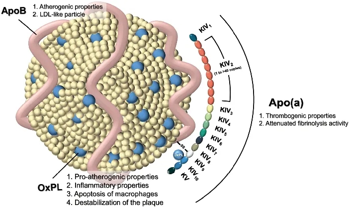 Lp(a)是一种与低密度脂蛋白(LDL)结构相似但更大的高度多态粒子。Lp(a)编码apo(a),在肝脏中高表达。载脂蛋白(a)以非共价和共价结合于载脂蛋白b-100。载脂蛋白(a)具有与纤溶酶原的kringle4结构域(KIV)同源的多个重复序列副本,随后是kringle5-like(KV)结构域和蛋白酶样结构域。[3]