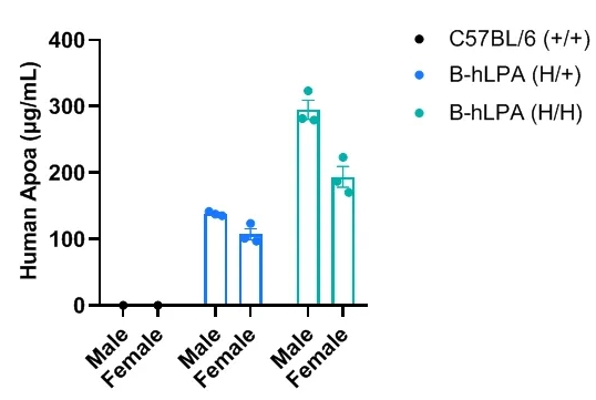 通过ELISA在B-hLPA小鼠中进行特异性Apo(a)蛋白表达分析。收集野生型C57BL/6小鼠、杂合B-hLPA小鼠、纯合B-hLPA小鼠血清,所有小鼠均为7周龄。每种性别的3只B-hLPA小鼠用于检测,每种性别的1只野生型C57BL/6小鼠作为对照。人类Apo(a)仅在杂合和纯合B-hLPA小鼠中可检测到,而在野生型C57BL/6小鼠中则无法检测到。