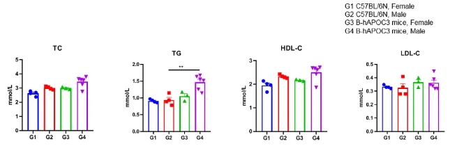分析B-hAPOC3小鼠和野生型C57BL/6小鼠(5周大)的血浆TG,TC,LDL-C和HDL-C浓度。B-hAPOC3小鼠的TG明显高于野生型C57BL/6小鼠。TG,甘油三酯;TC, 总胆固醇;HDL-C,高密度脂蛋白胆固醇;LDL-C,低密度脂蛋白胆固醇。