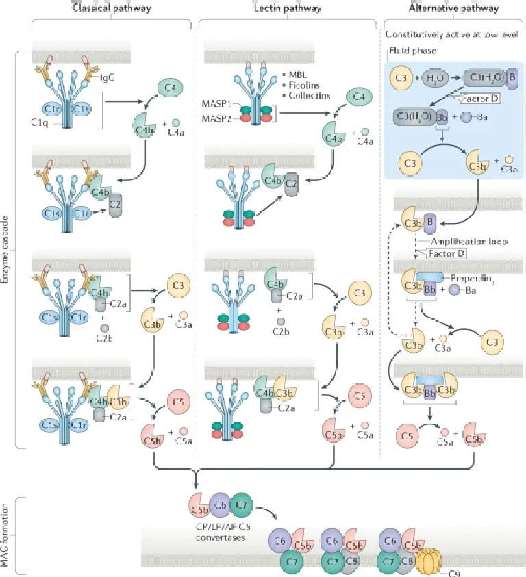 替代途径与经典和凝集素途径的不同之处在于,它会自发且持续地以低速活动,并且其激活可以被放大。该途径涉及因子D,它在正常血液中主要以其活性形式存在,以及唯一已知的补体系统的积极调节器——固定素。替代途径C3转化酶的初始组装效率取决于病原体细胞壁内末端糖的密度或结合C3b微环境内自身末端唾液酸的密度。将额外的C3b与现有的替代途径C3转化酶结合,产生C5转化酶,导致C5a和C5b的产生。[2]